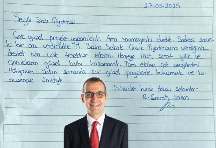 “Sevgili Şişli Tiyatrosu, çok güzel projeler yapacaktık. Ama sanmayın ki durduk. Sadece zorunlu bir ara verdirildik. Bizim Sokak Çocuk Tiyatrosuna verdiğiniz destek için çok teşekkür ederim. Her şeye inat sanat, iyilik ve çocukların güzel kalbi kazanacak. Tüm ekibe çok sevgilerimi iletiyorum. Yakın zamanda çok güzel projelerde buluşmak ve konuşmak ümidiyle… Silivri’den kucak dolu selamlar.”